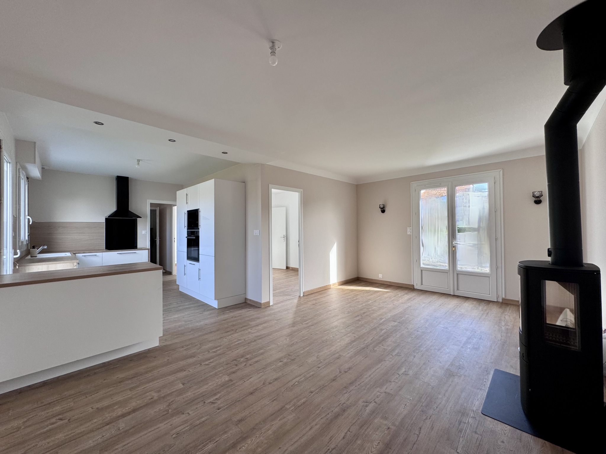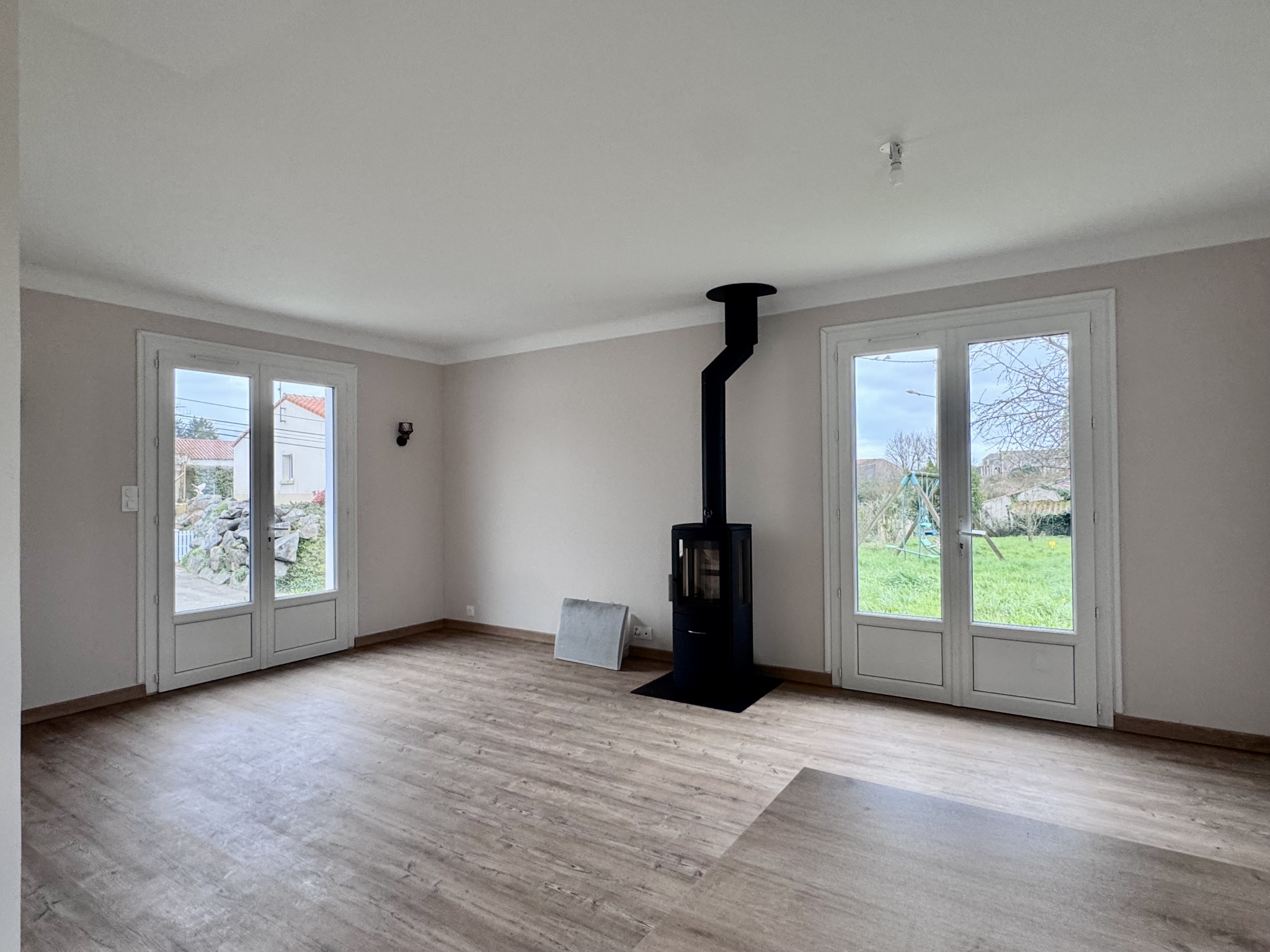 Une pièce de vie baignée de lumière avec poêle à bois pour des soirées cocooning.