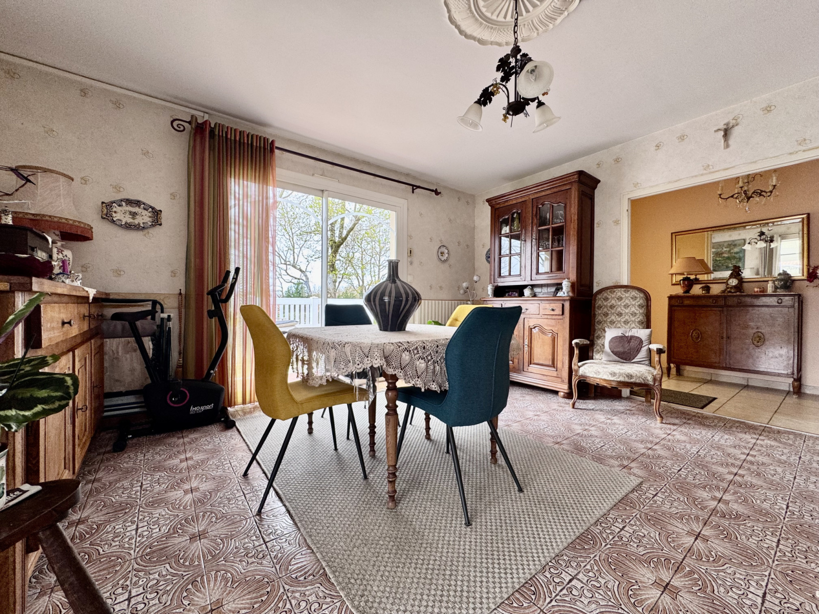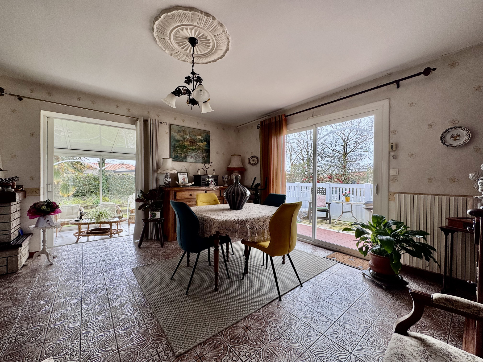 Espace de vie : Un salon séjour accueillant avec cheminée à insert, ouvert sur une magnifique véranda chauffée. Grâce à sa baie à galandage, la transition entre intérieur et extérieur est totale.