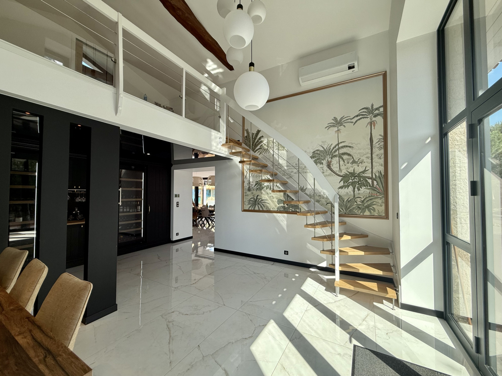La maison principale, une ancienne grange rénovée de 243 m², vous séduira par son charme et ses prestations haut de gamme. Dès l'entrée, vous serez impressionné par un hall cathédrale qui s'ouvre sur un intérieur lumineux. La cuisine de 36 m², conçue par un professionnel, est un véritable bijou, avec sa cave de dégustation intégrée. La salle de réception de 50 m², baignée de lumière grâce à ses larges baies vitrées et ses stores motorisés, est idéale pour recevoir.