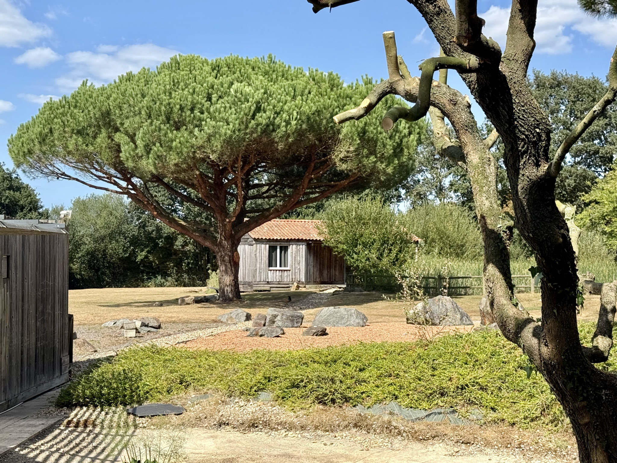 Pour vos invités, un chalet canadien avec vue sur l'étang offre une pièce de vie, deux chambres et une salle d'eau, pour un séjour en toute indépendance.