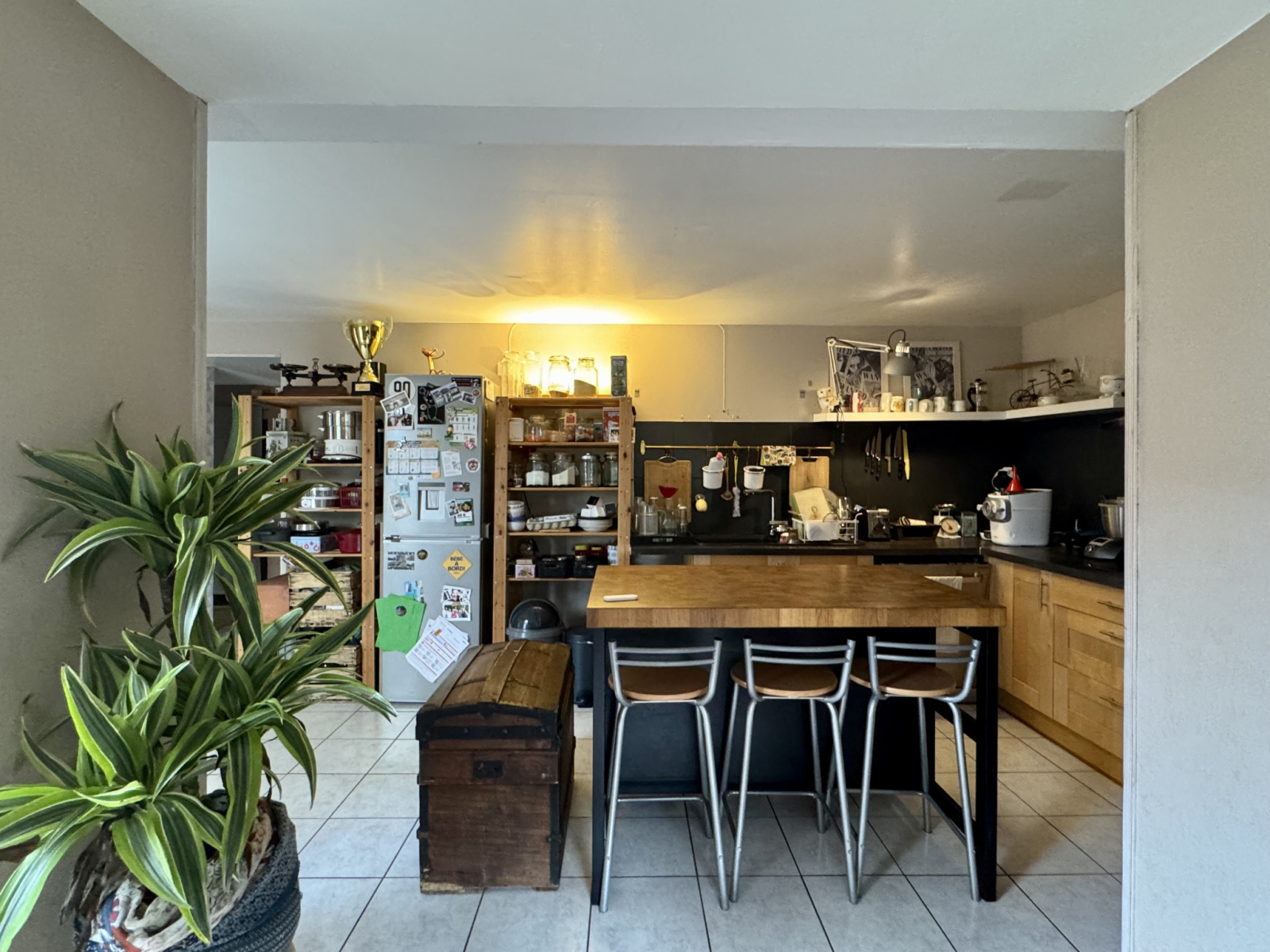 Un espace de vie atypique intégrant cuisine, salon, salle à manger et une véranda récente.