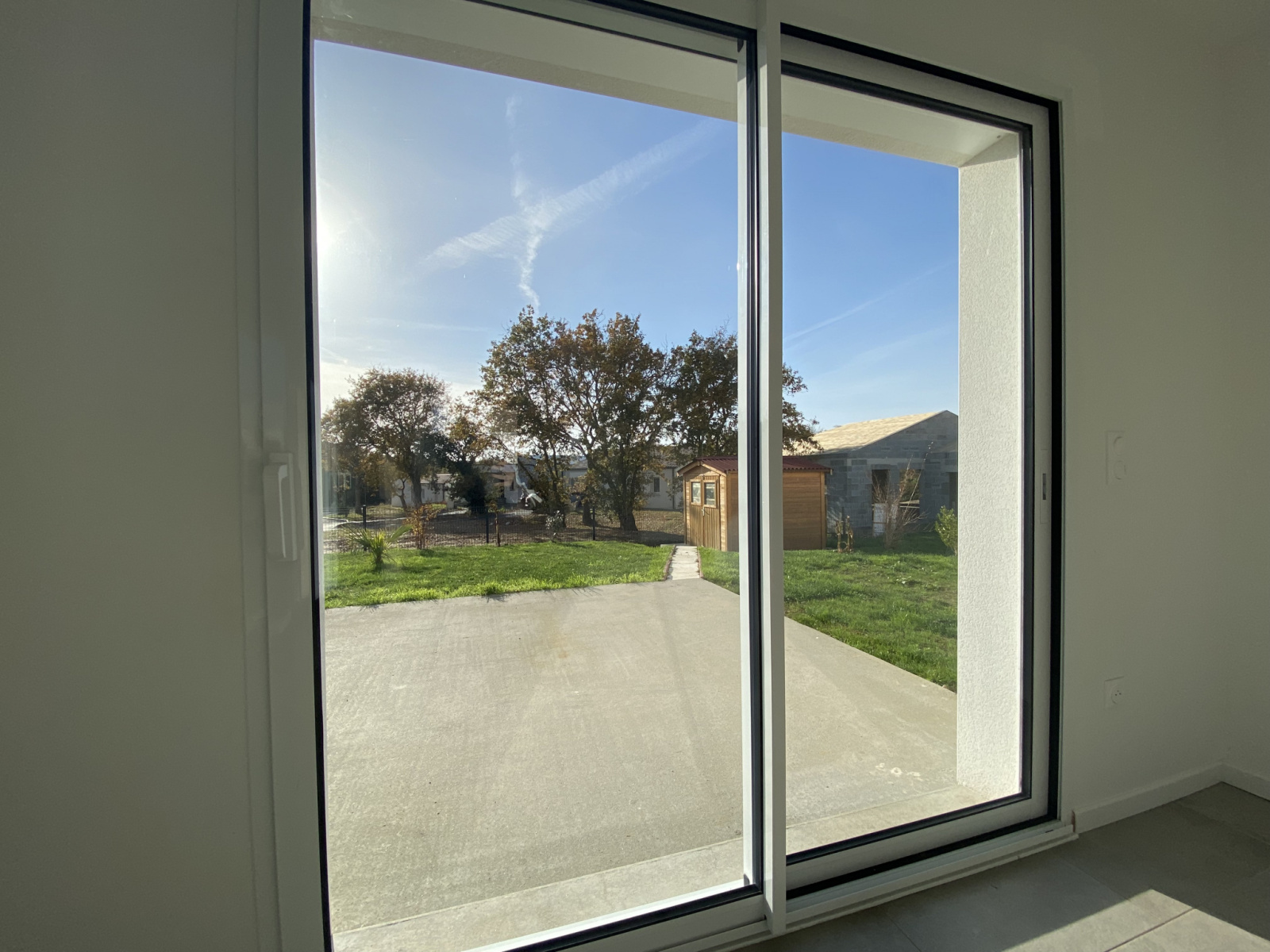 Le terrain de 352 m2 est clos avec portillon, chalet de jardin en bois et places de stationnement.
