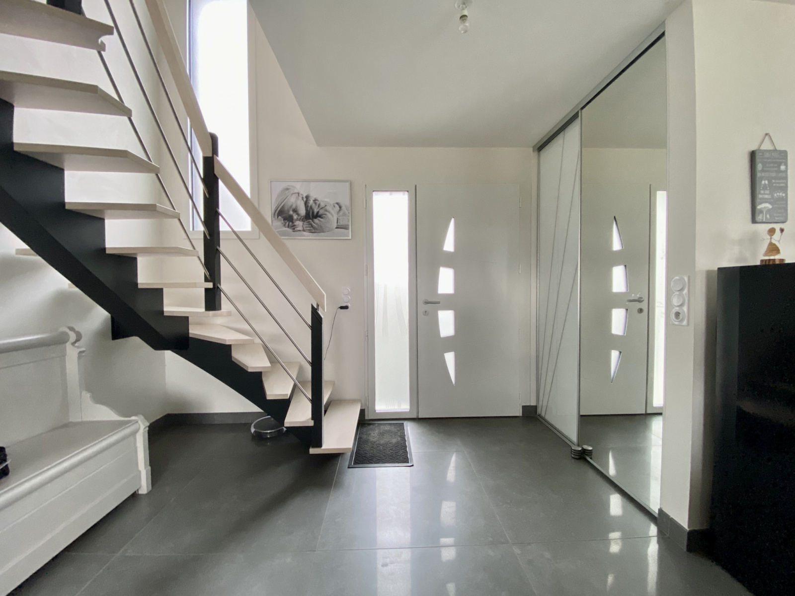 La visite de ce bien débute par un hall d’entrée, équipé d’un grand placard (idéal pour du rangement !), une belle pièce de vie fusionnant avec une jolie cuisine aménagée et équipée.