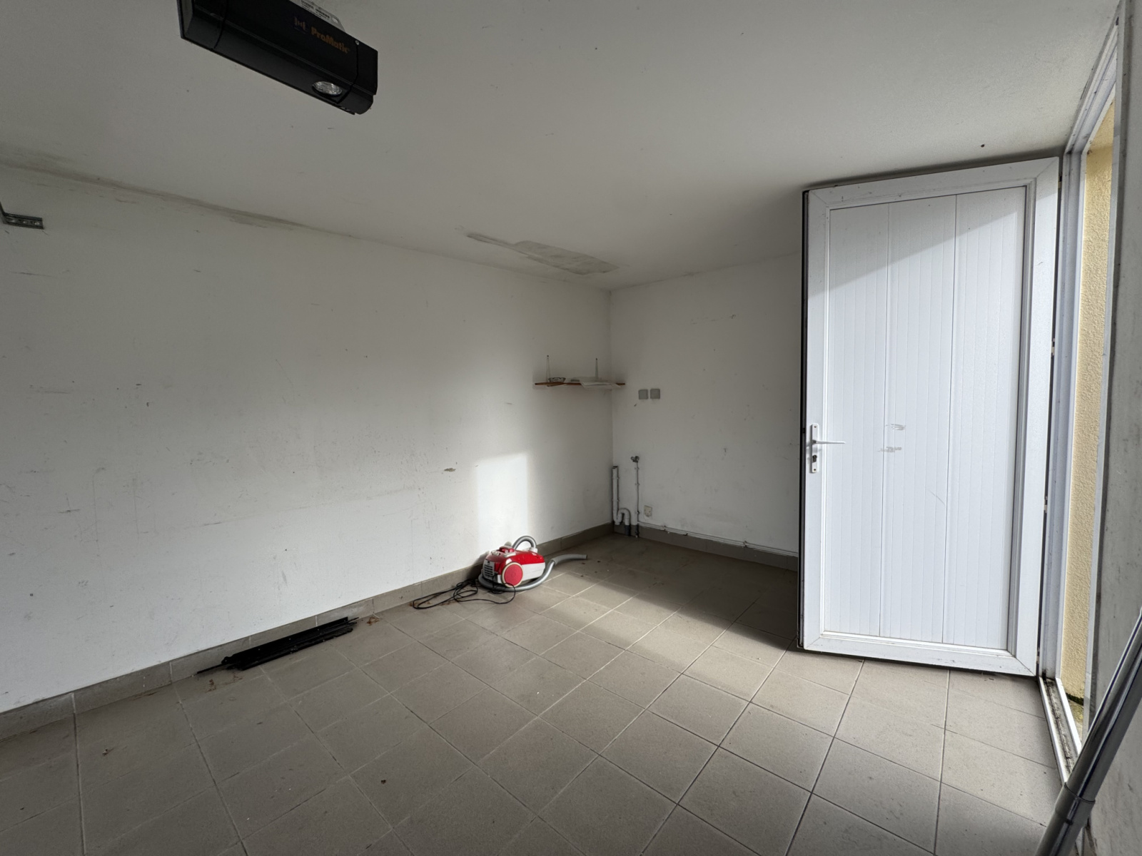 Grand garage attenant et carrelé avec espace buanderie, porte de service sur le jardin et porte motorisée.