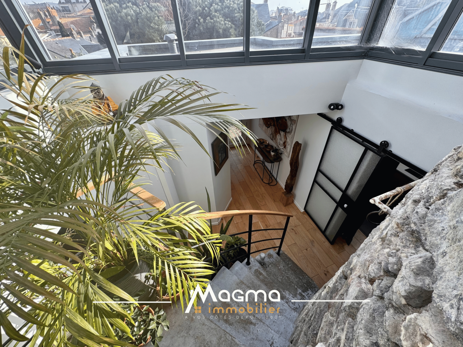 Dès l'entrée, l'émotion opère : une splendide hauteur sous plafond s’ouvre sur un toit de verre, inondant le parquet massif de lumière naturelle.