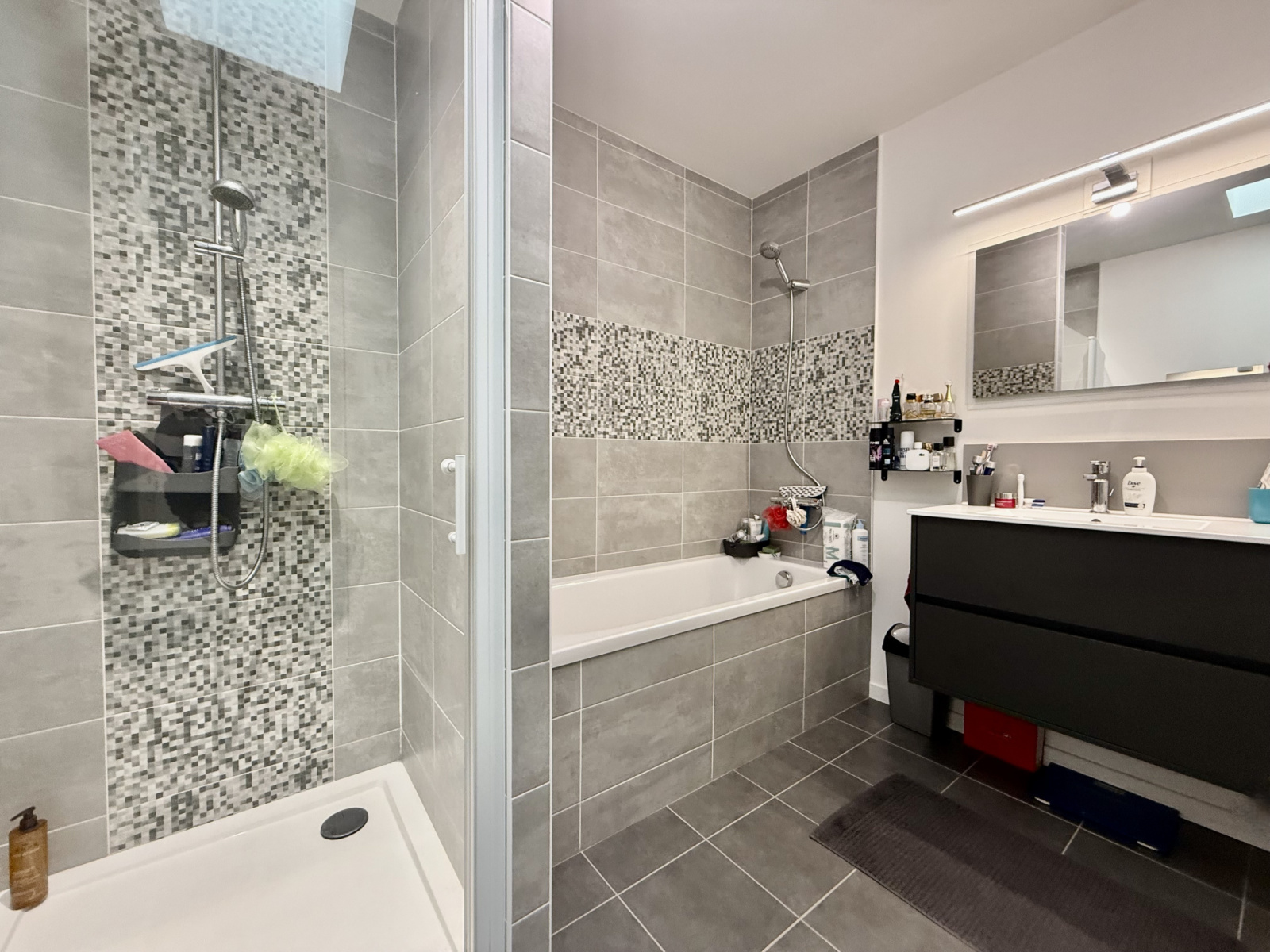 Une salle de bains complète avec baignoire et douche.