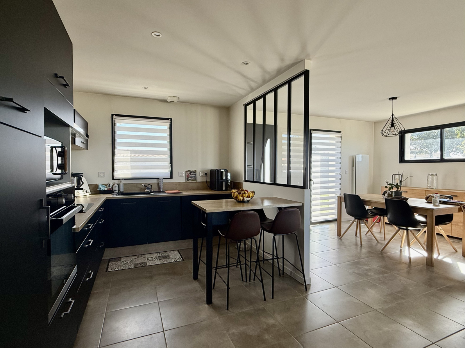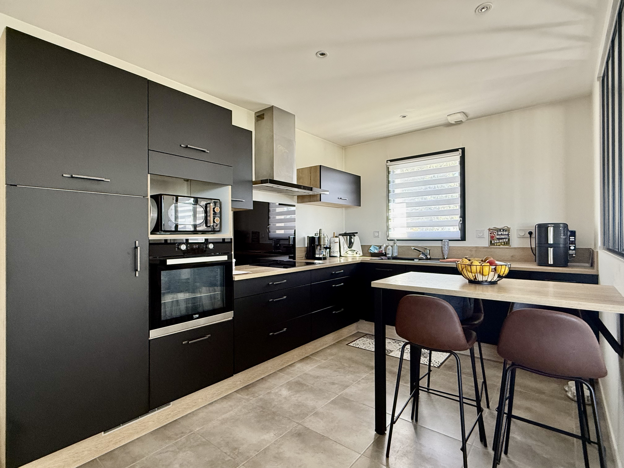 Une cuisine ouverte entièrement aménagée et équipée (avec coin repas).