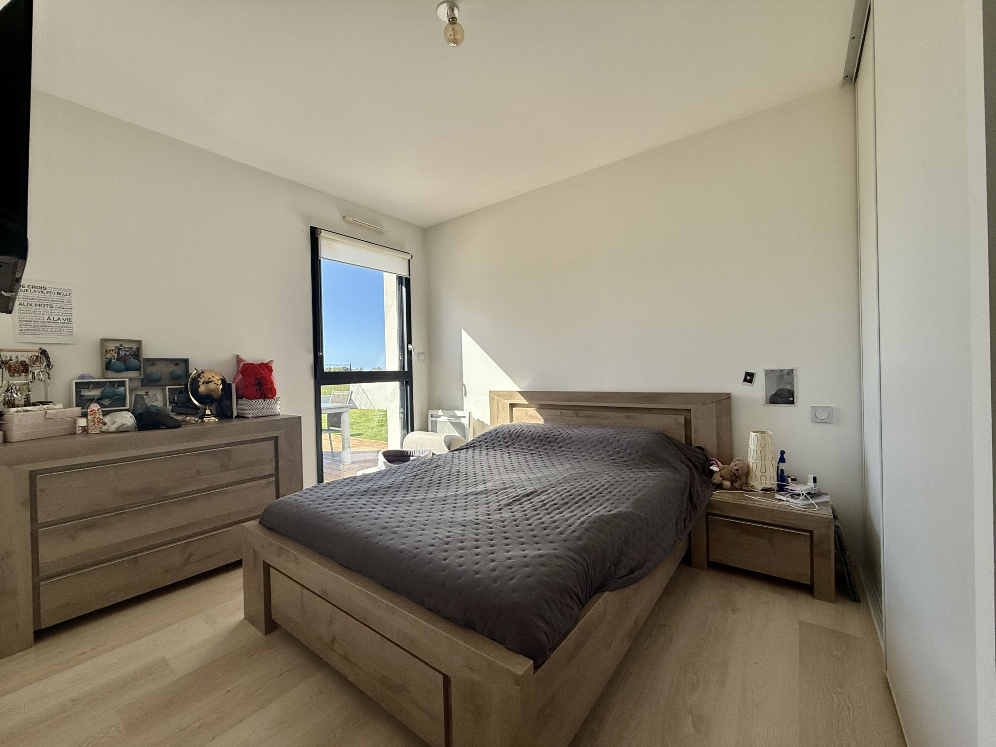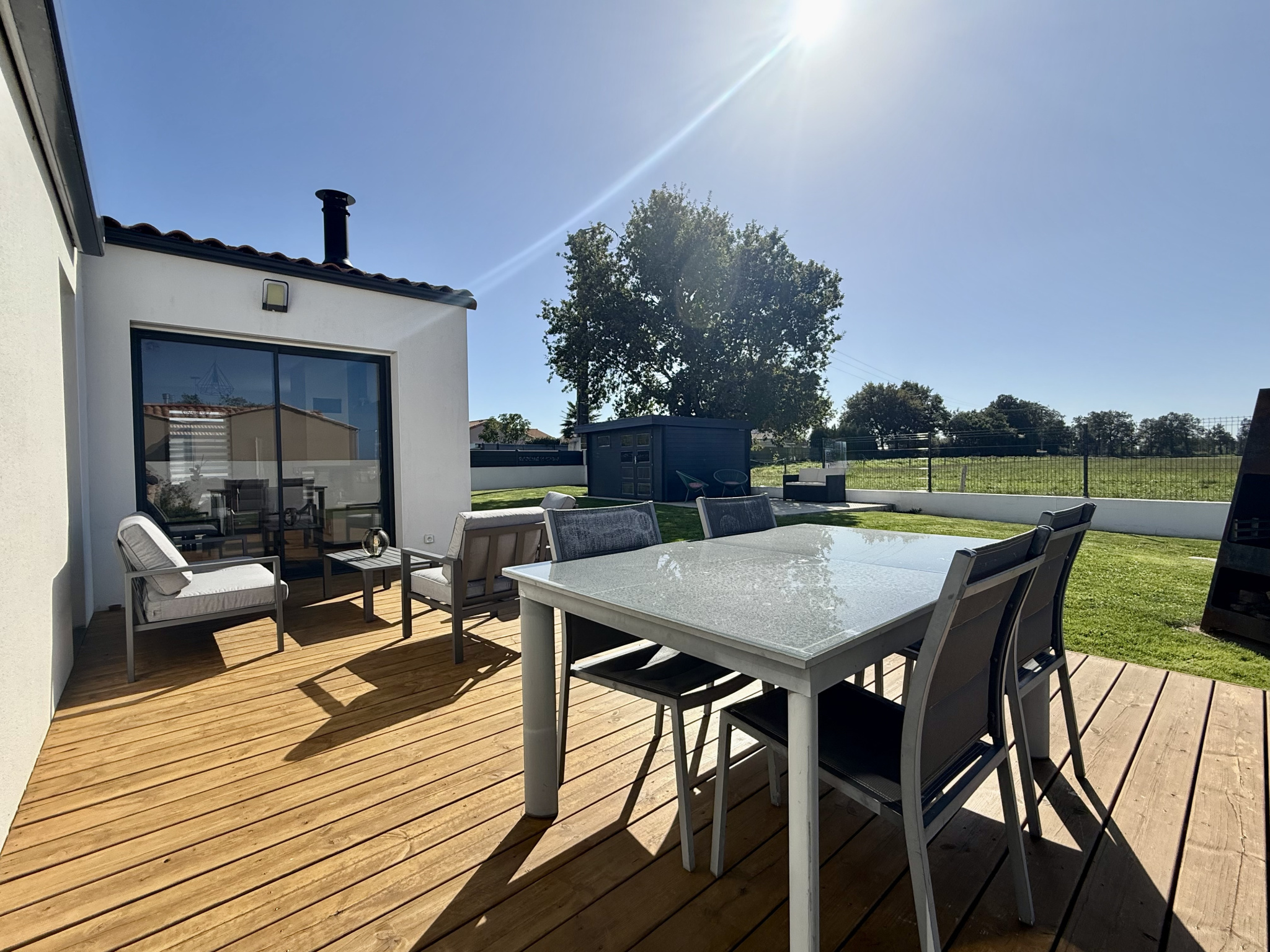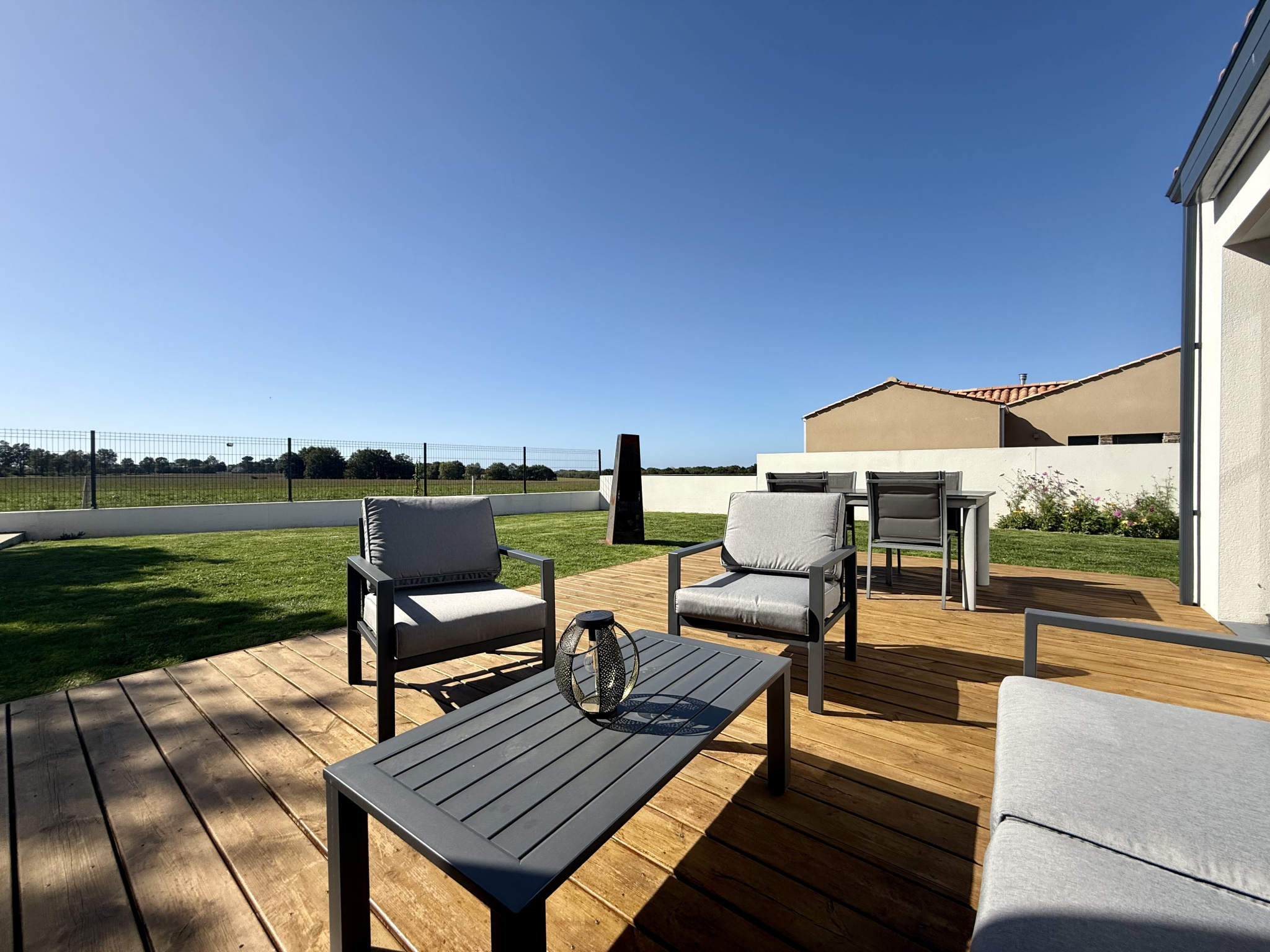 Une agréable terrasse en bois exposée Sud-Ouest, équipée d'un store banne électrique pour profiter pleinement de l'extérieur.