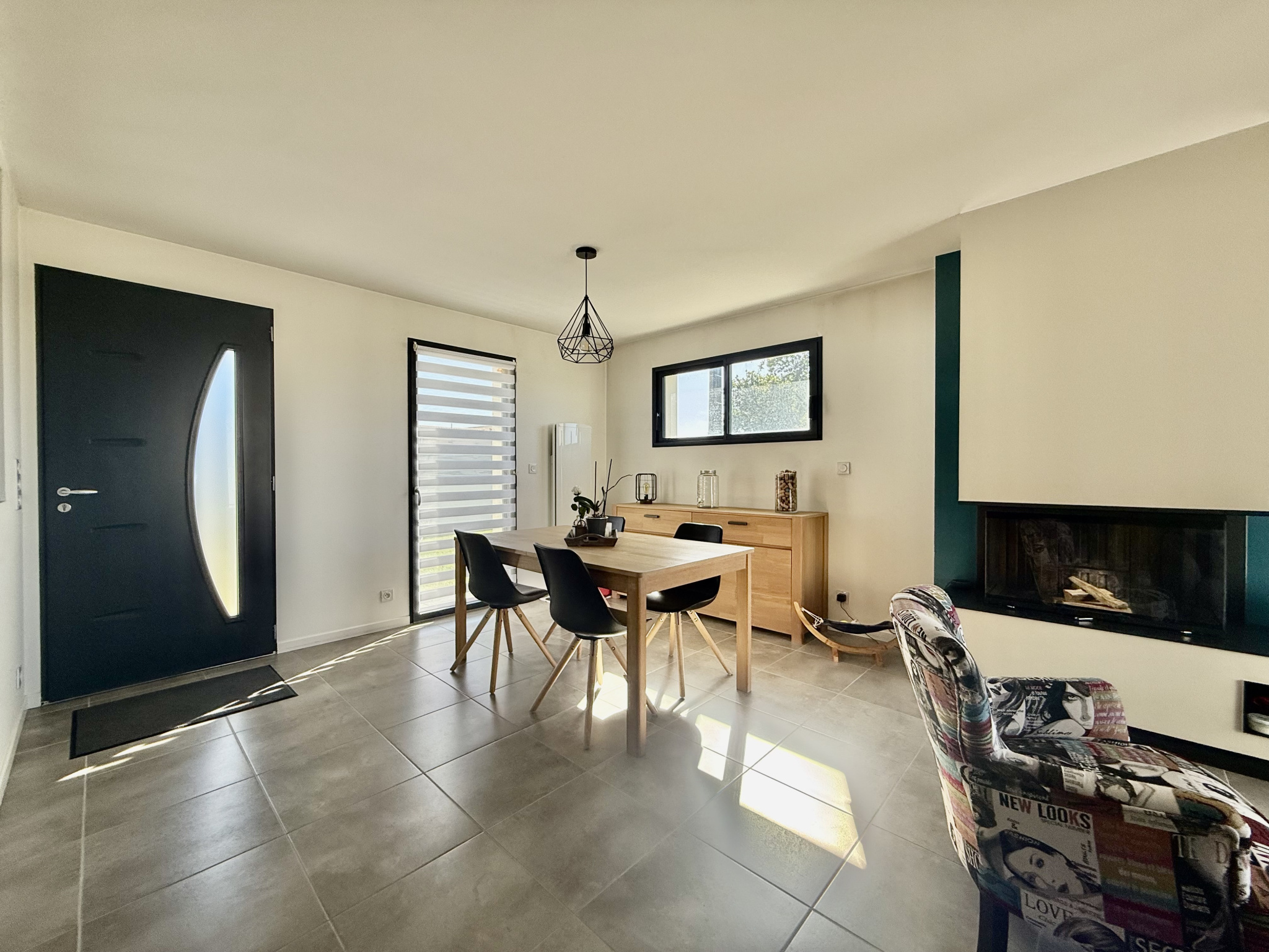 Une très belle pièce de vie de 40 m² baignée de lumière grâce à ses trois expositions (Sud/Est/Ouest). Elle est réchauffée par une cheminée à insert.