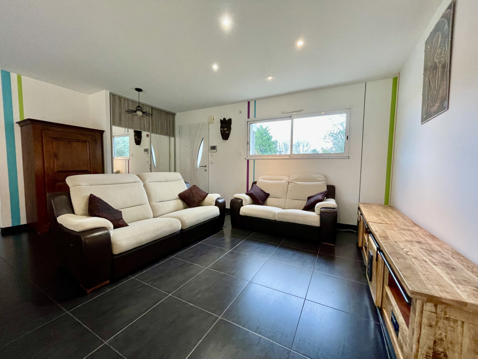 La porte d'entrée passée, vous serez sous le charme de cette pièce de vie de 47m2 avec son espace salon avec placard, sa salle à manger et son accès direct sur la terrasse de 70m2 et sa cuisine équipée-aménagée avec son ilôt central. Un bureau avec placard complète cet espace de vie.