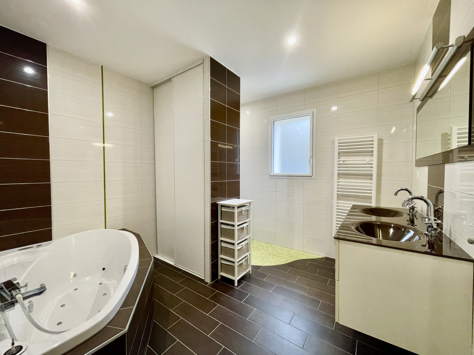 Côté nuit, 2 chambres avec placard, une chambre avec son dressing et une pièce d'eau de plus de 9m2 composée d'une baignoire balnéo, d'une grande douche à l'italienne, d'un meuble double vasque, placard et sèche-serviettes.