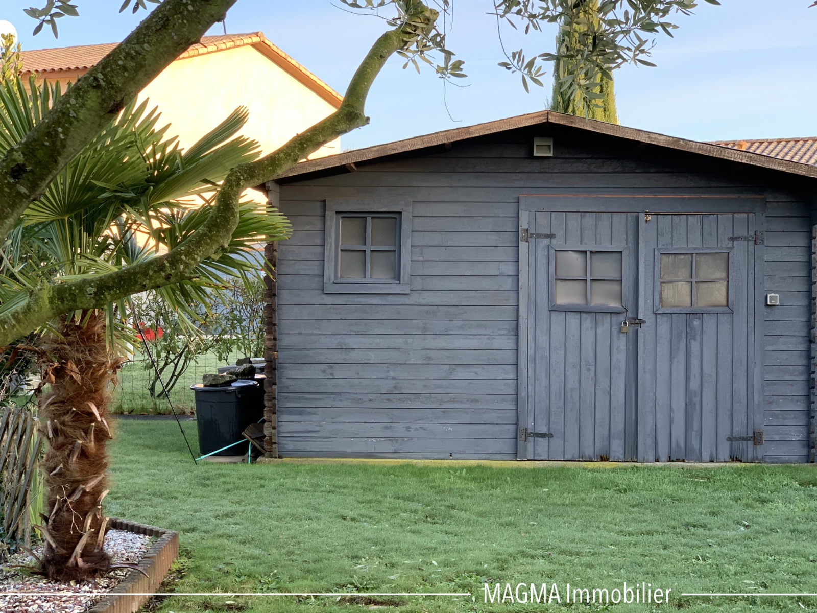 La maison, de plain-pied, bénéficie d’un grand garage attenant, avec porte de service sur le cellier et sur le jardin, d’environ 37m² avec possibilité de faux-grenier.