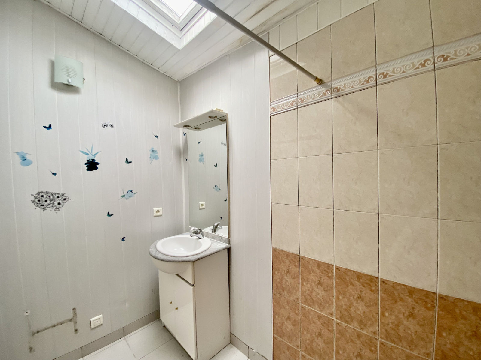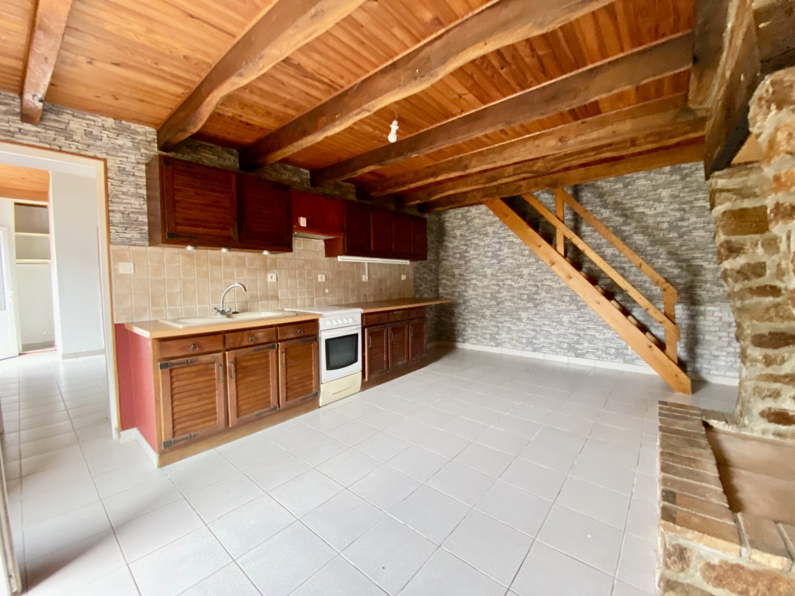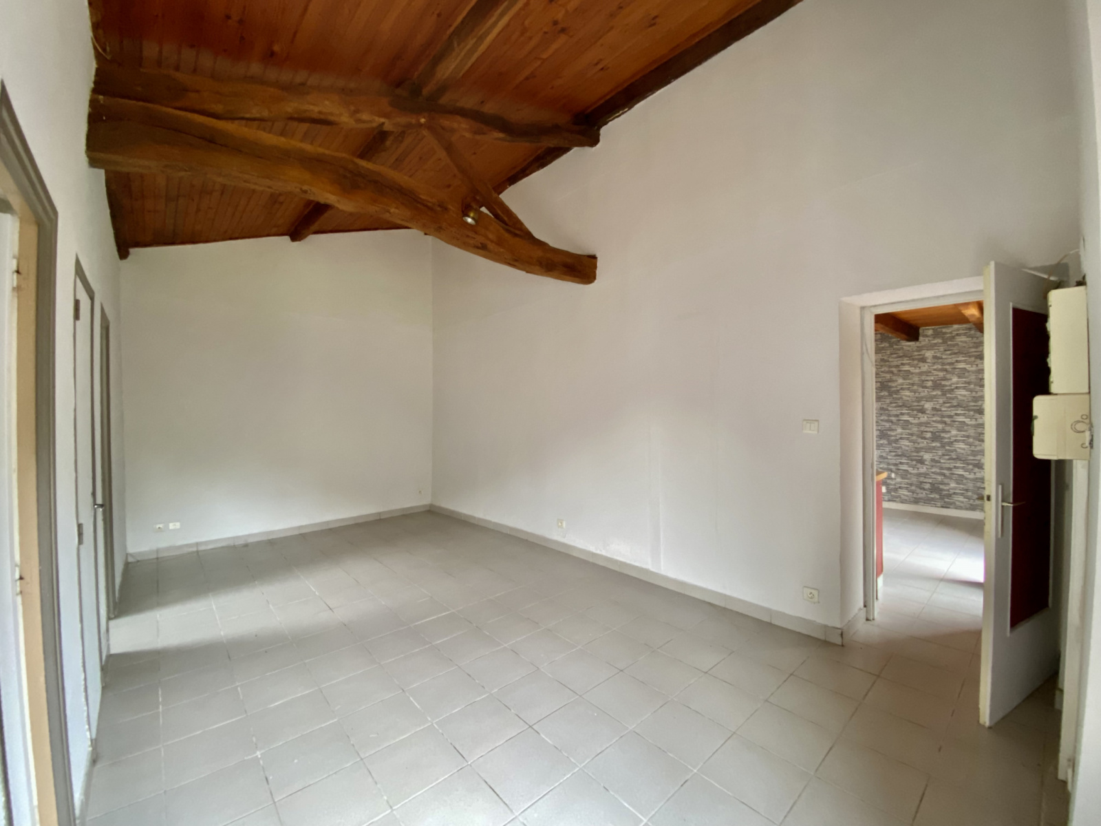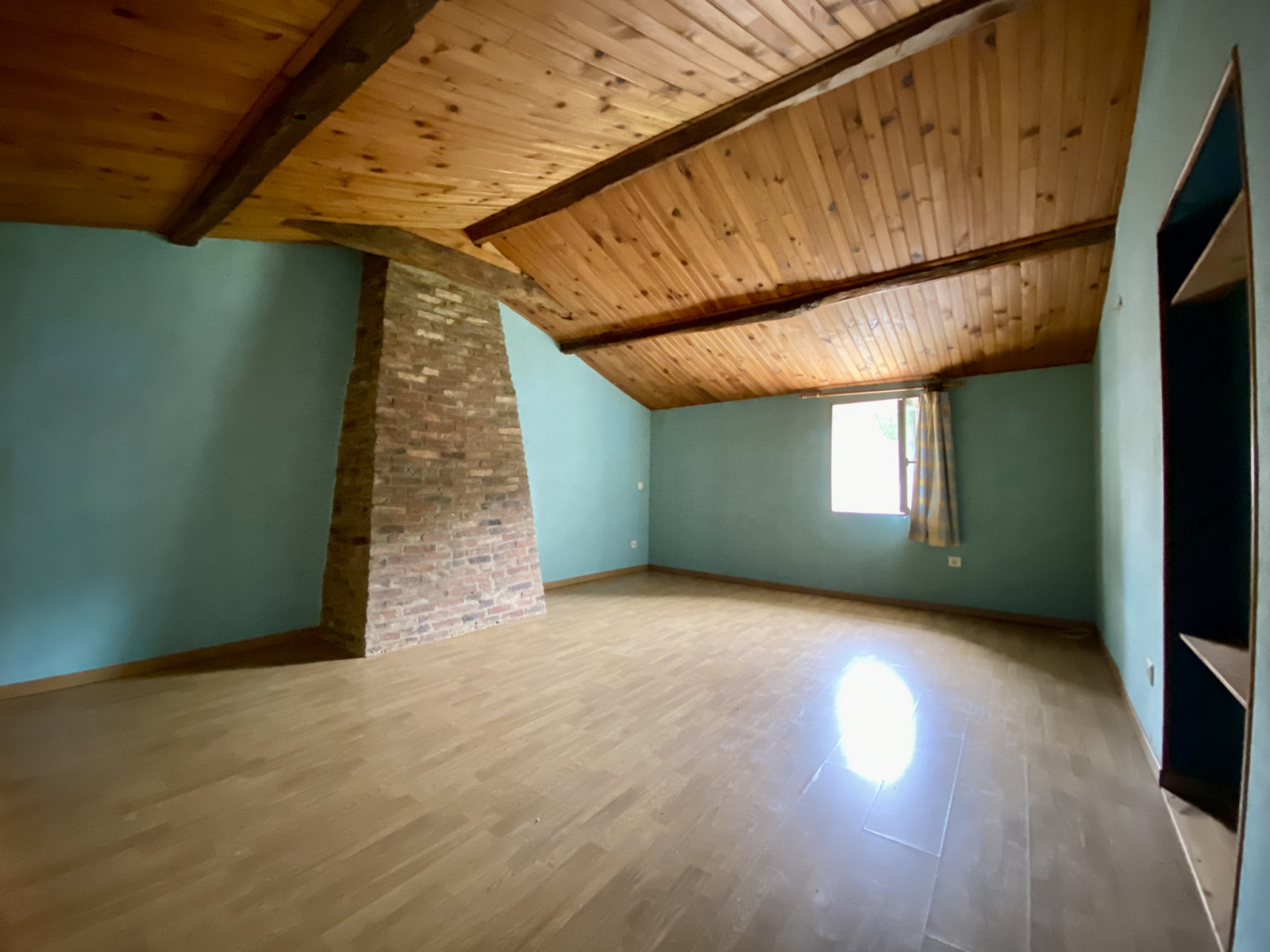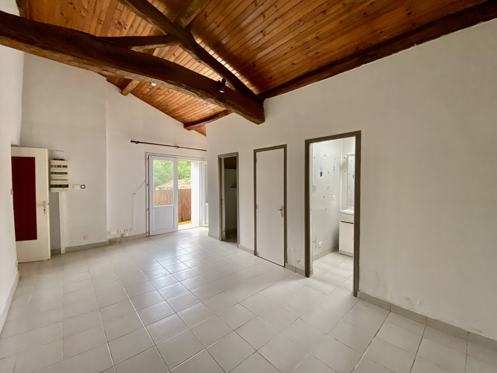 Actuellement , elle se compose d’une cuisine- salle à manger, d’un espace salon, d’une grande chambre avec plafond rampant, d’une salle d’eau et de wc indépendants.