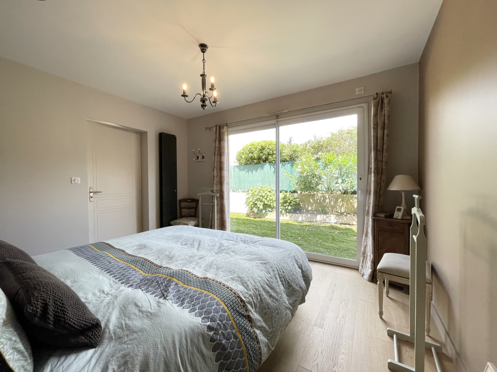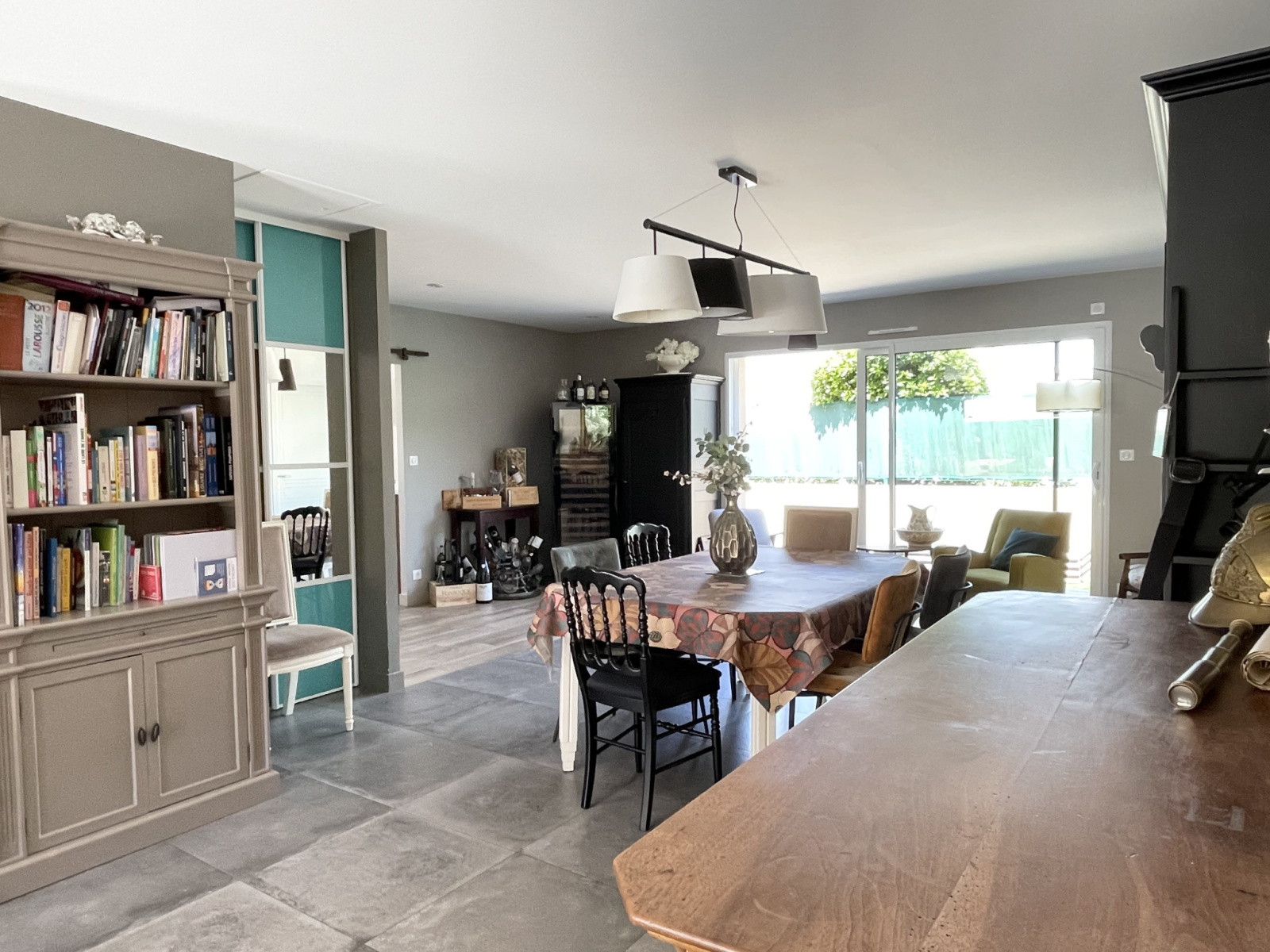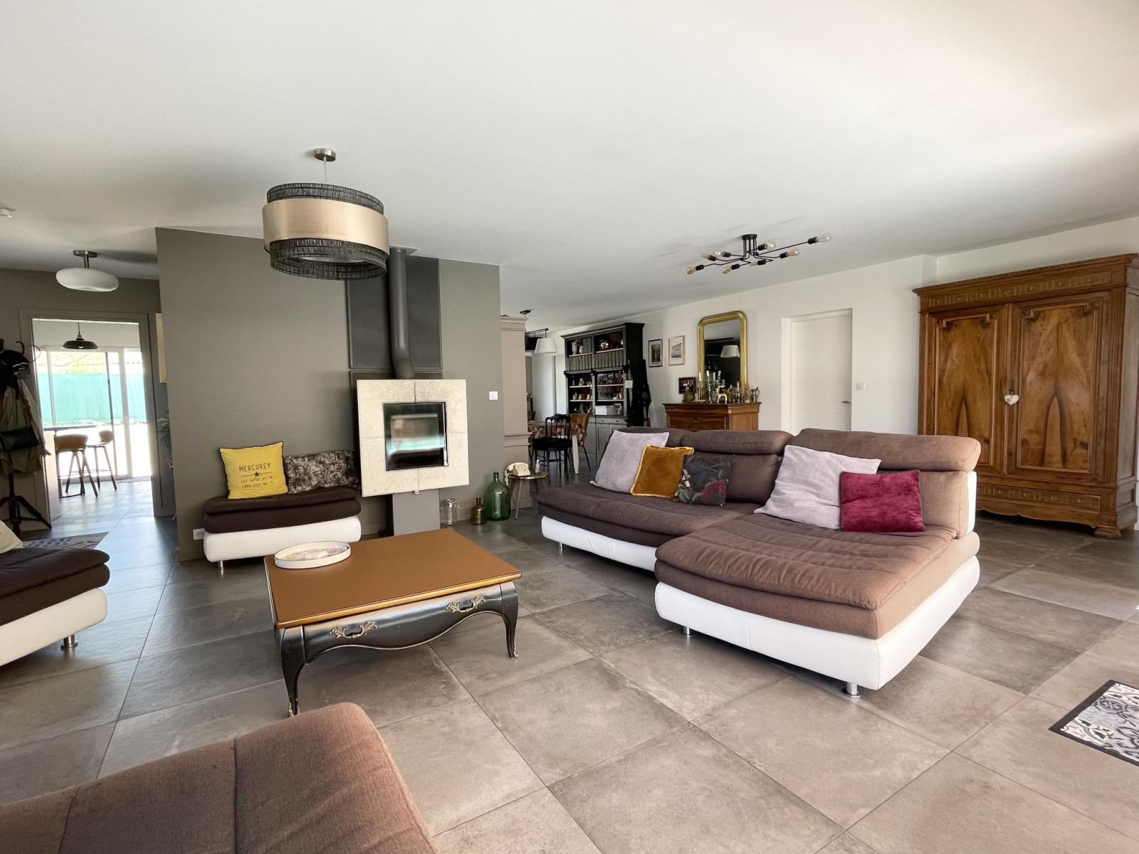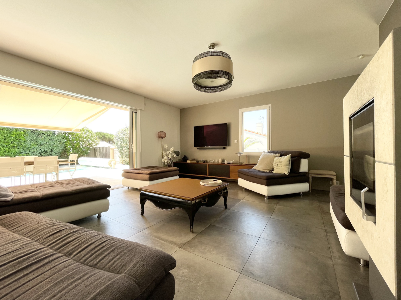 Elle offre un espace de vie confortable de plus de 70m2 avec sa baie magistrale à galandage de près de 5m donnant sur une grande terrasse en travertin exposée sud-ouest dotée d’une piscine chauffée.