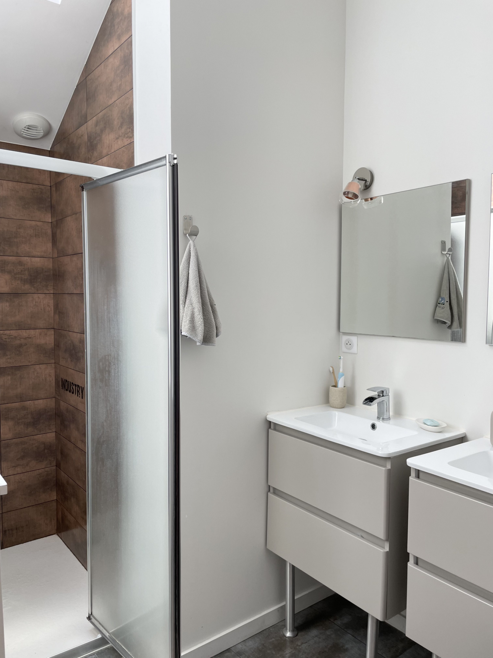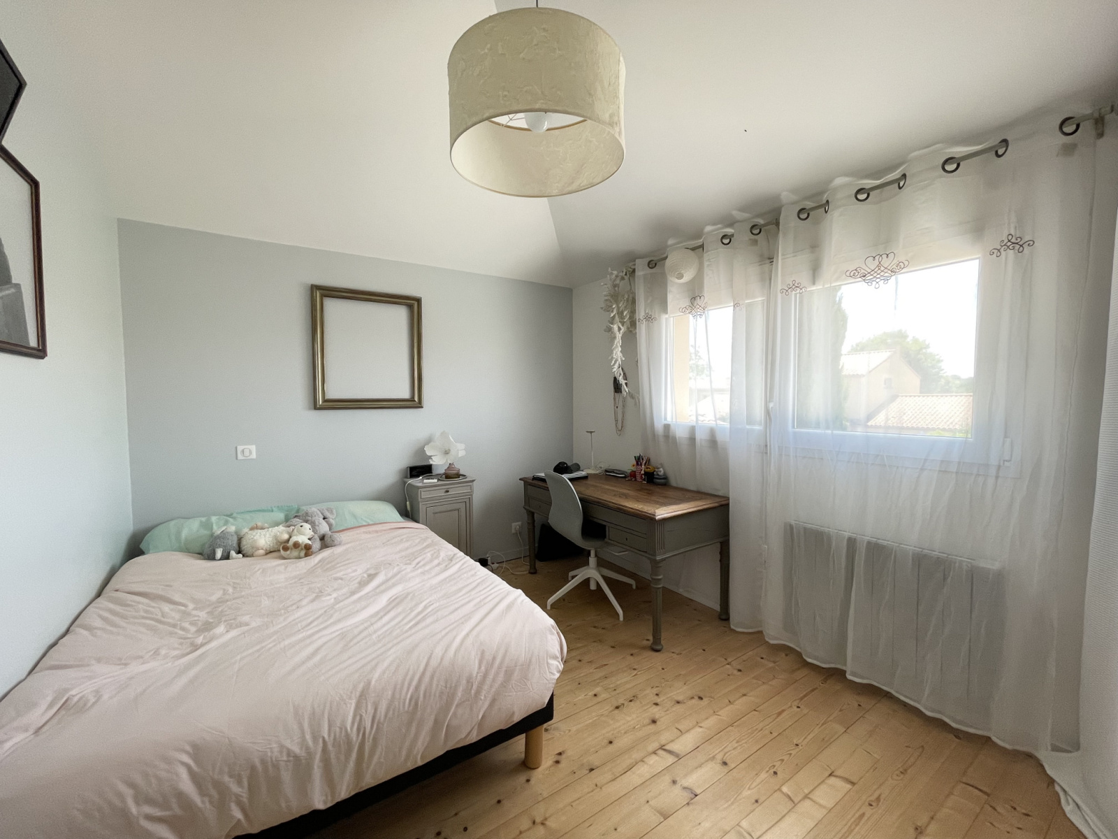 A l’étage, vos enfants ou invités apprécieront leur espace nuit muni de deux belles chambres avec hauteur sous plafond. Un pallier avec placard, wc et une salle d’eau complètent ce niveau.