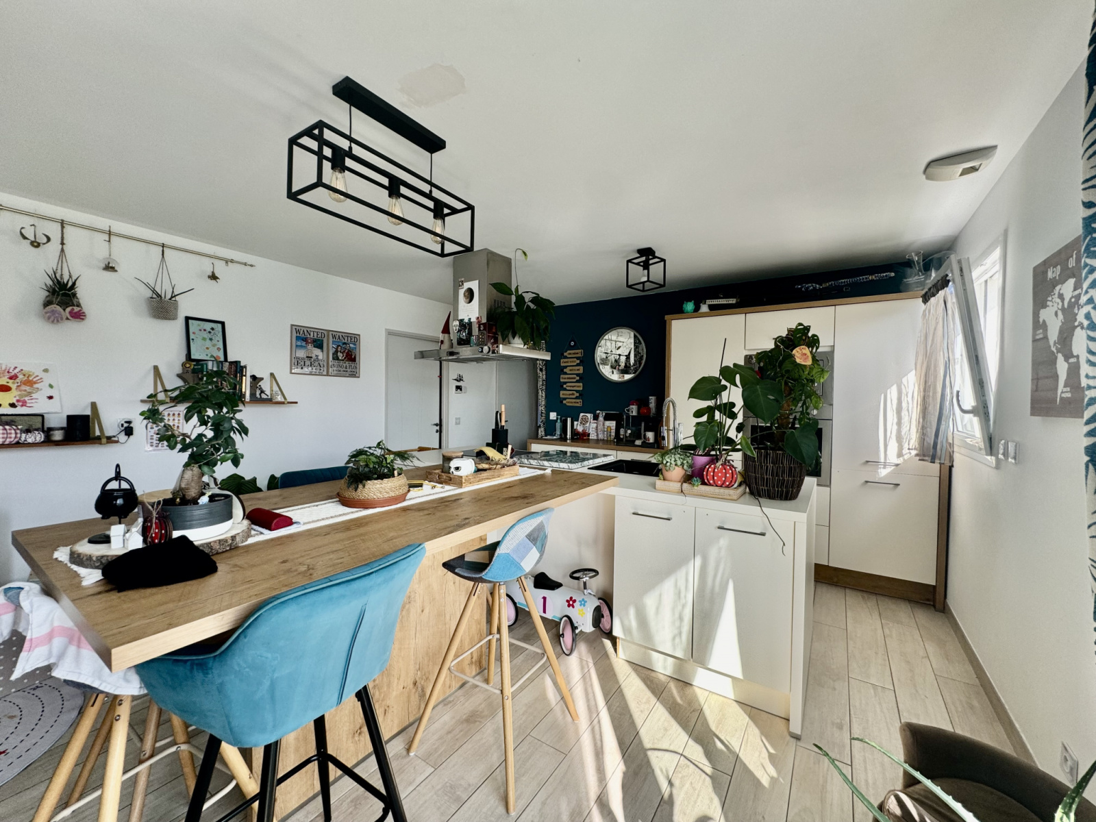 L’intérieur offre une belle pièce de vie d’environ 34 m², baignée de lumière grâce à ses 3 ouvrants dont une baie exposée au sud.